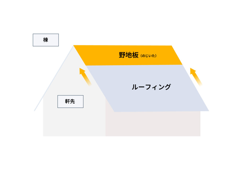ルーフィングは、屋根の低い部分である「軒先」から、高い部分である「棟」に向かって順番に葺き上げます。
