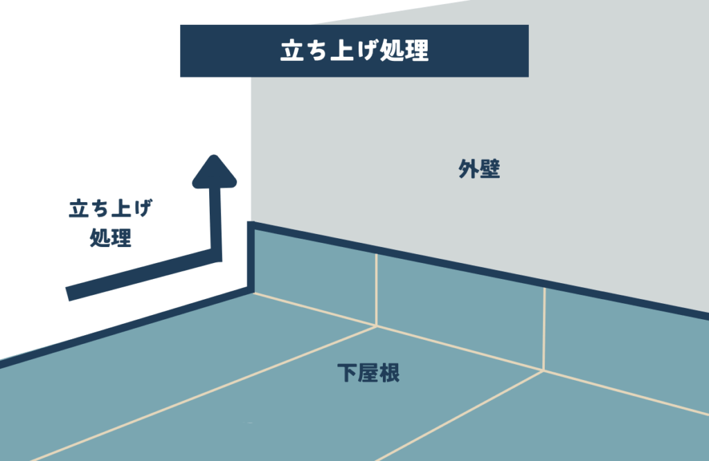 ルーフィングの端を壁側に沿って立ち上げるように施工することで、水の侵入経路を完全に断ちます。