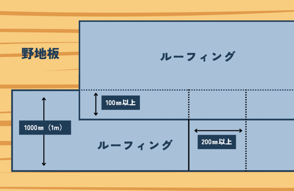 一般的に上下方向は100mm以上、左右方向は200mm以上が目安です。この重ね部分が、水の浸入を防ぐ重要な役割を果たします。