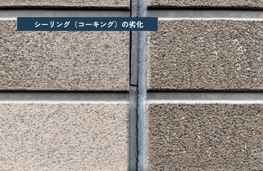 サイディングボードの継ぎ目(目地)や、窓サッシの周囲などを埋めているゴム状の素材です。この部分は、地震などの揺れによる動きを吸収したり、隙間からの水の浸入を防いだりする重要な役割を担っています。しかし、主に紫外線の影響で時間とともに弾力性が失われ、硬化してひび割れたり(破断)、痩せて隙間ができたりします。これは雨水の主要な浸入口となりやすい箇所です。