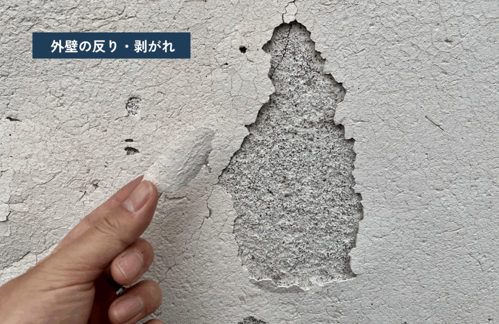 これは劣化がかなり進行している状態と考えられます。ひび割れやシーリングの隙間から長期間にわたって水が浸入し、外壁材(特に窯業系サイディングなど)がその水分を吸収・乾燥を繰り返すことで発生します。外壁材自体が変形(反り)したり、表面の塗装や素材が剥がれたりしている場合、壁の内部や構造体までダメージが及んでいる可能性が非常に高いサインです。