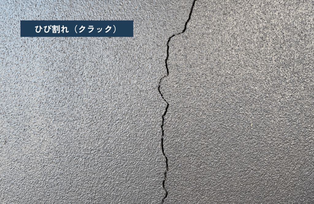 塗膜や外壁材そのものに発生する割れを指します。この隙間から雨水が浸入すると、壁の内部にある断熱材を濡らして性能を低下させたり、さらには建物の構造体(木材の腐食や鉄骨のサビ)にまで悪影響を及ぼしたりする危険性があります。最初は髪の毛ほどの細いひび割れ(ヘアクラック)であっても、放置すると徐々に大きな割れに進行することがあるため注意が必要です。