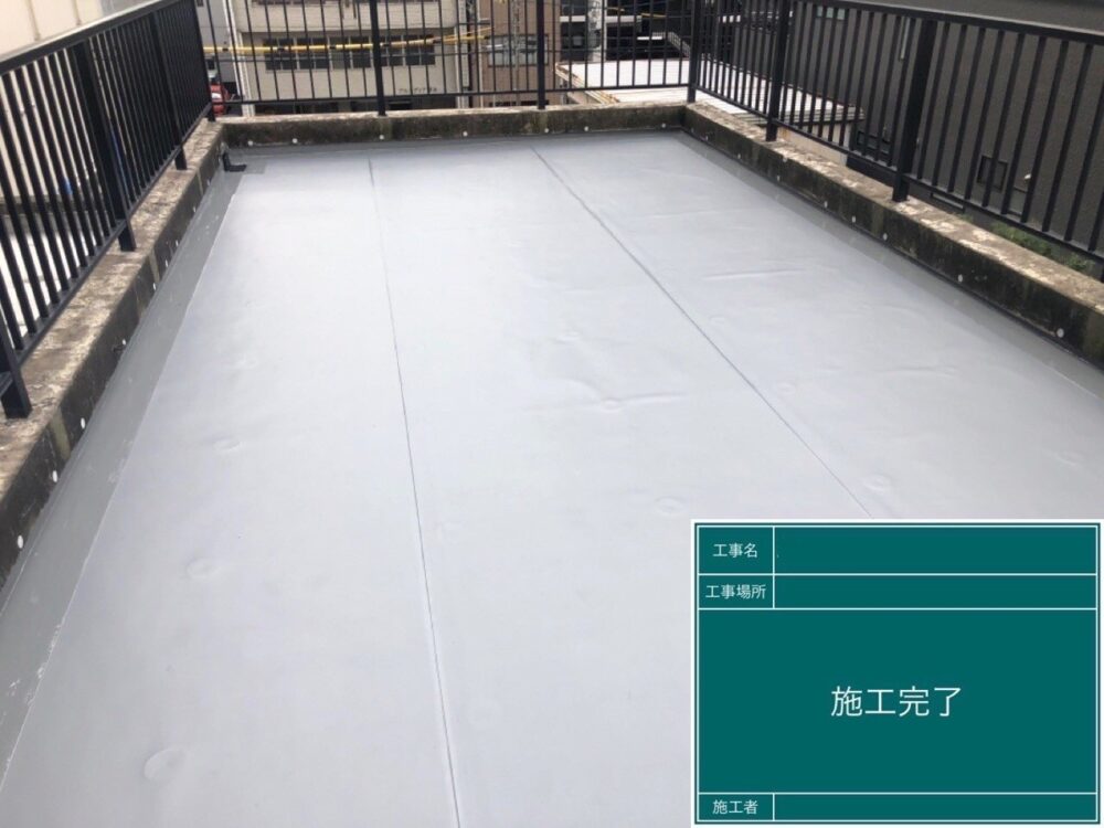平場から立ち上がり部分までムラなく塗膜が形成され、雨水の浸入リスクを大幅に軽減できる仕上がりとなっています。明るいグレーの防水層は見た目にも美しく、建物全体の耐久性向上にもつながる安心の施工となりました。