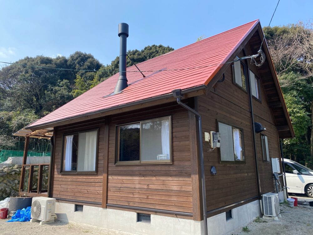 赤い屋根が映える!煙突のあるログハウスを美しくリフレッシュ