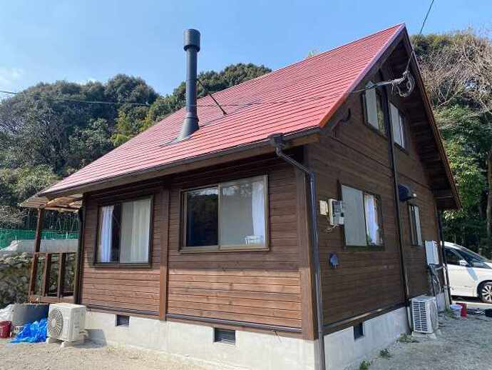 煙突のあるすてきなお家の住宅塗装。屋根のカラーは赤色へ。