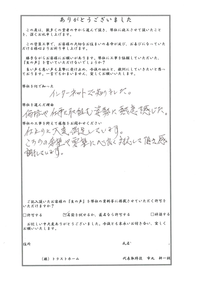 塗装のプロならではの知識をお伝えでき、施工完了まで終えれたこと感謝しております。