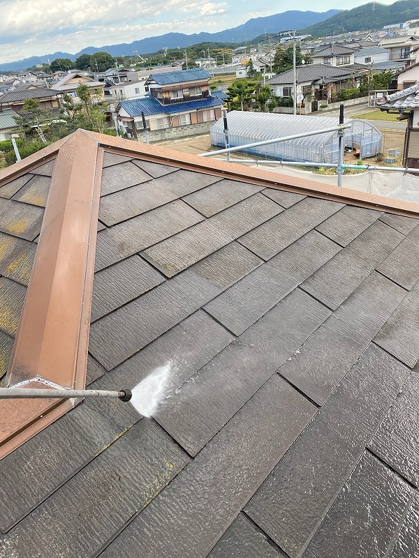今回の屋根は、藻やコケ汚れが特に多かったため、洗浄工程を念入りに行いました。