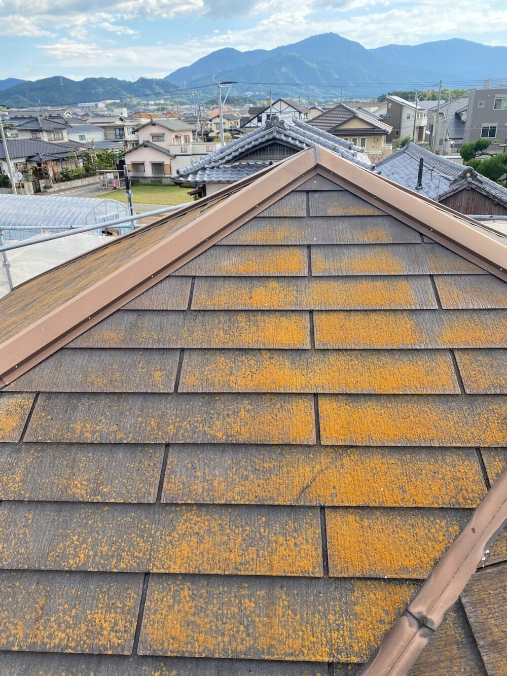 築10年を過ぎた屋根では、表面にオレンジ色の藻やコケが広範囲に発生し、見た目にも大きく影響していました。