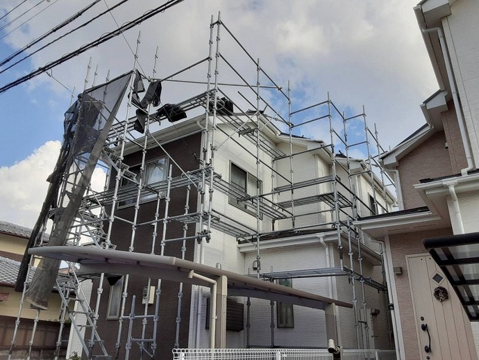 足場を設置し、これから丁寧に補修・洗浄・塗装を進めていきます。