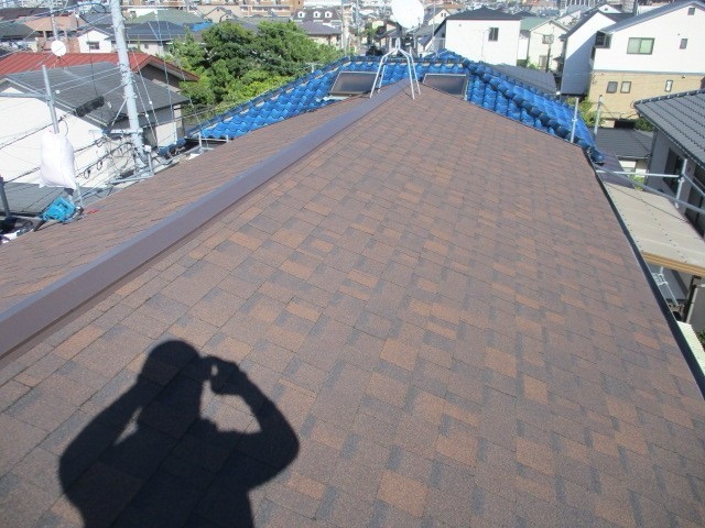 破損していた瓦をすべて撤去し、軽量で耐風性に優れたアスファルトシングル屋根へ葺き替えました。