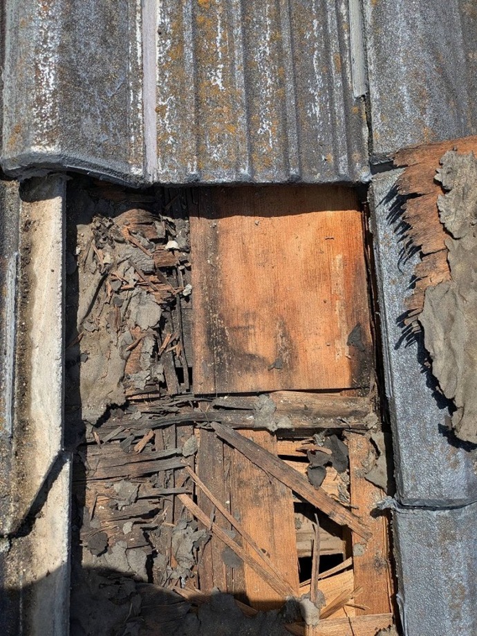 瓦屋根を撤去すると、野地板が腐食し、ボロボロになっていました。防水性能がなくなった屋根から、雨漏りが発生し、室内の天井にも被害が広がっている状態でした。今回は、瓦屋根を撤去し、スレート屋根へ葺き替え工事を行いました。