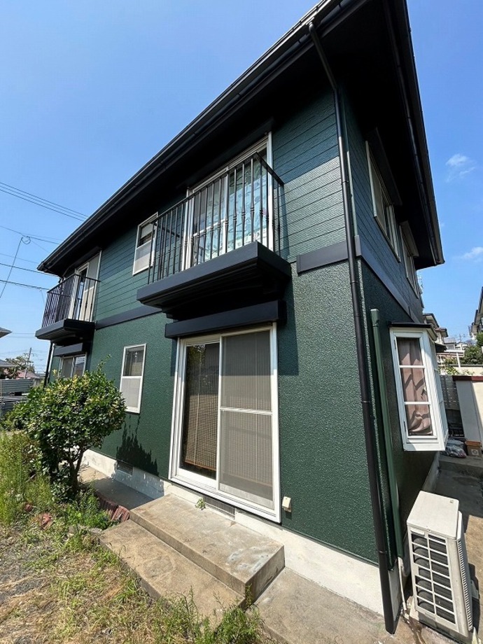 糟屋郡宇美町のK様邸では、2色カラーの外壁を1色のモスグリーンに塗り替えを行いました。深みのあるモスグリーンを使用することで、存在感と重厚感のある外観に仕上げました。付帯部にはトゥルーブラック を採用することで、更に引き締まった外観に。