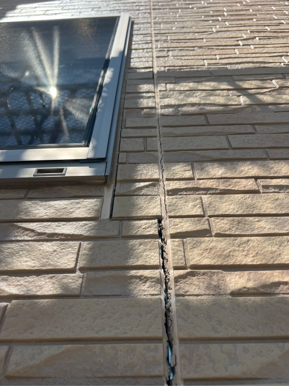 外壁の目地部分でコーキングが大きく裂け、内部まで見えてしまっている状態です。
