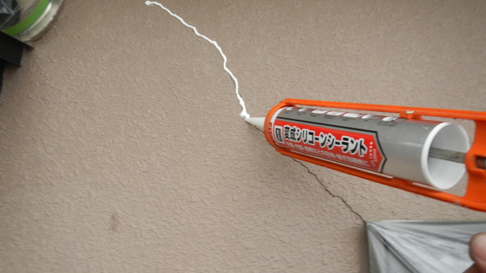 まずは下地補修を行いました、。ひび割れの補修には万能なコーキング材の変性シーラントを使用しています。