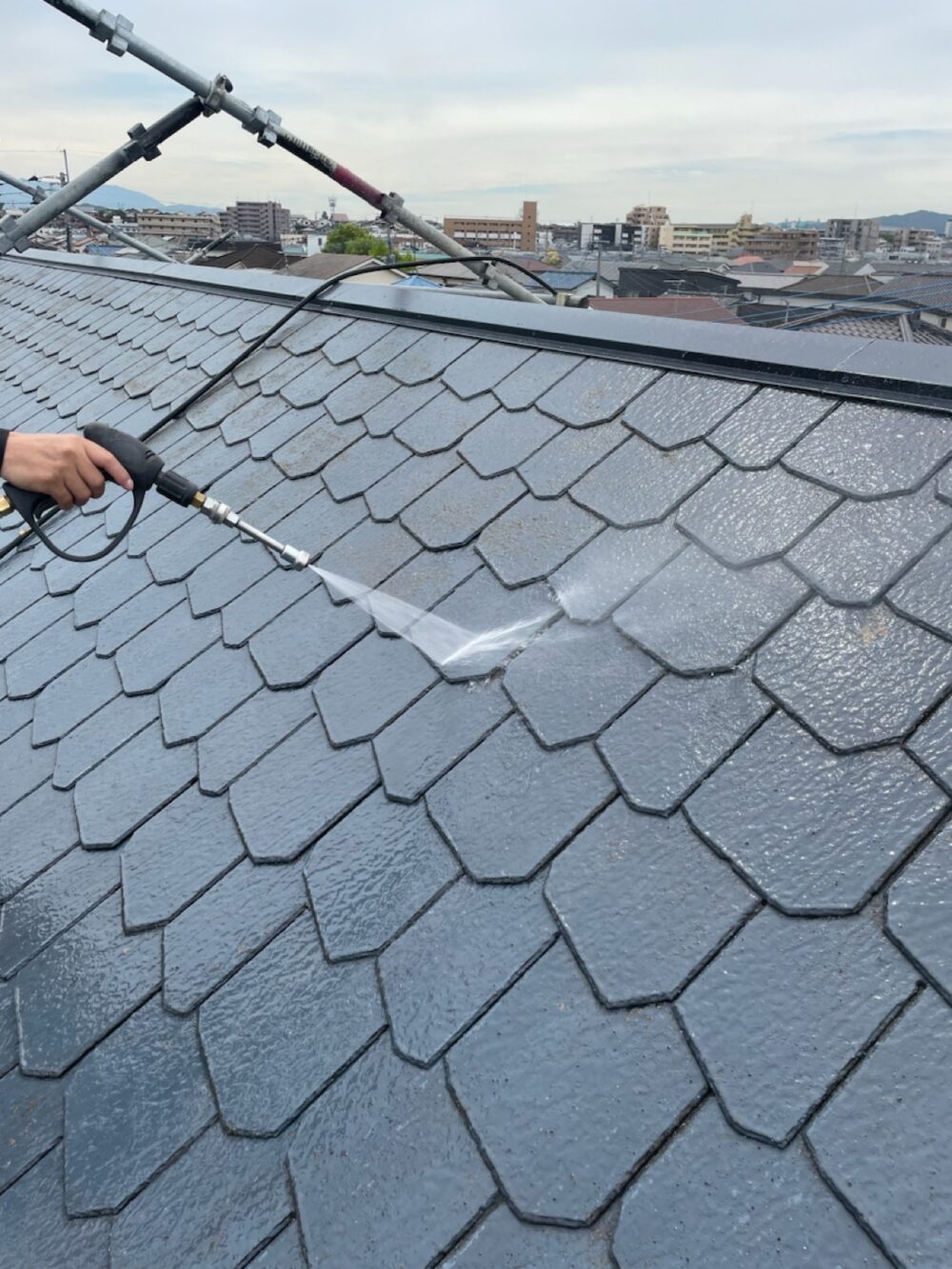 今回の屋根は、表面の汚れやコケが広範囲に付着しており、まず高圧洗浄で徹底的に汚れを除去しました。