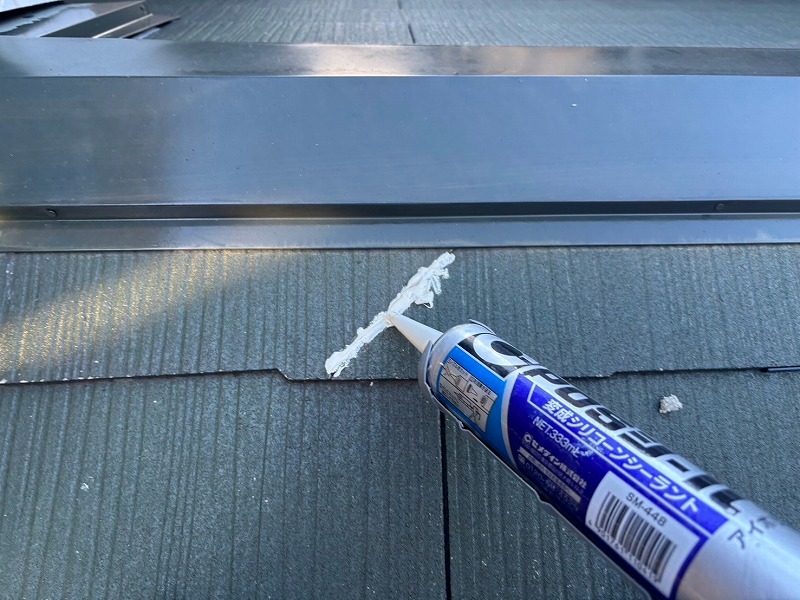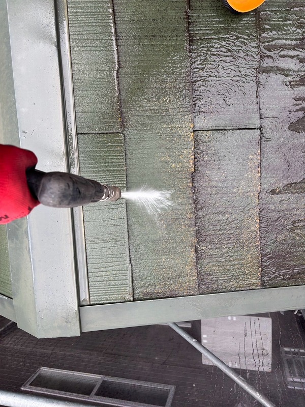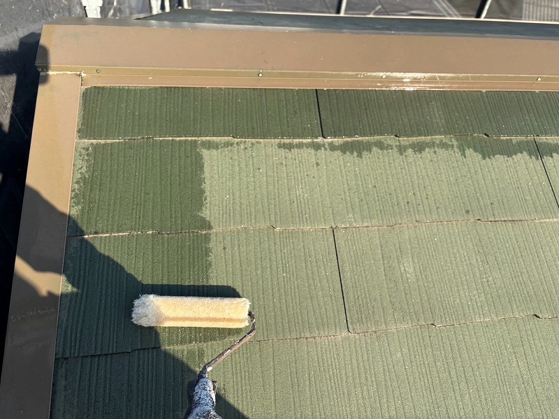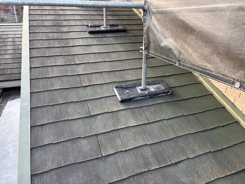屋根材表面には経年によるくすみやムラが確認でき、塗装によるメンテナンスが必要な状況でした。