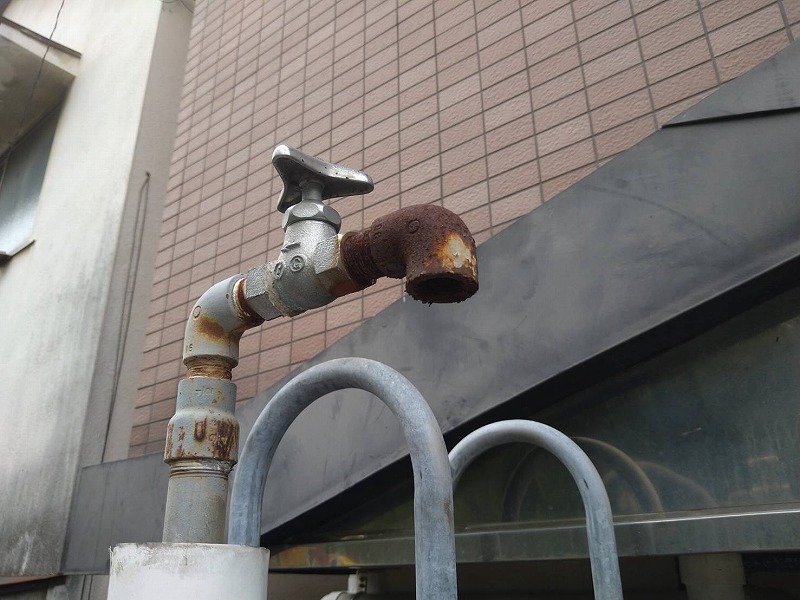 共用部に設置された屋外蛇口および配管部分には、サビの発生が広範囲に進行しており、特に蛇口先端や継ぎ手部分に赤サビが目立つ状態でした。