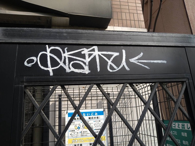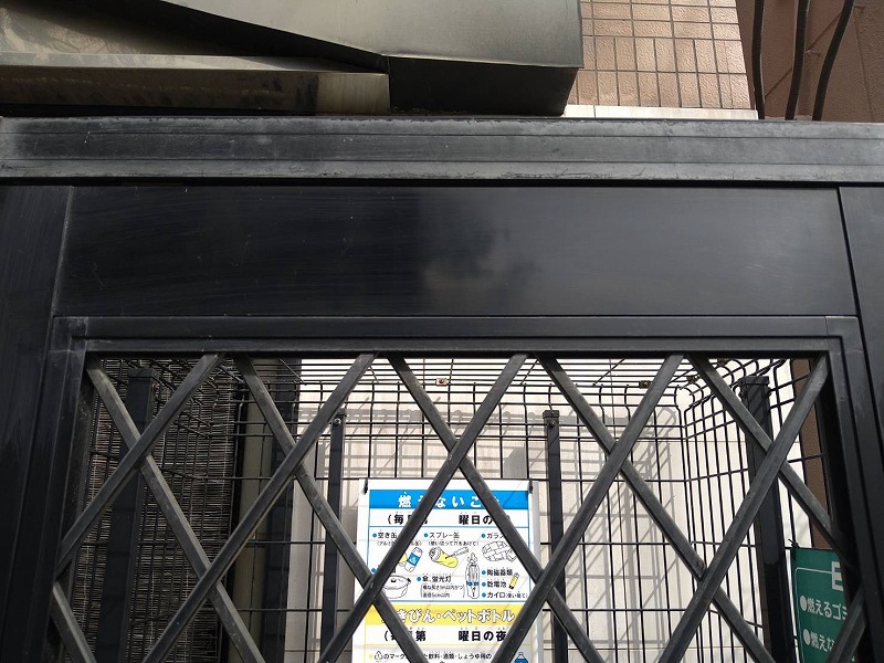 ゴミ置き場の扉・パネル部分には、スプレーやペンによる落書きが確認できる状態でした。共用部の中でも特に目につきやすい場所のため、物件全体の印象を大きく損ねてしまっている状況でした。