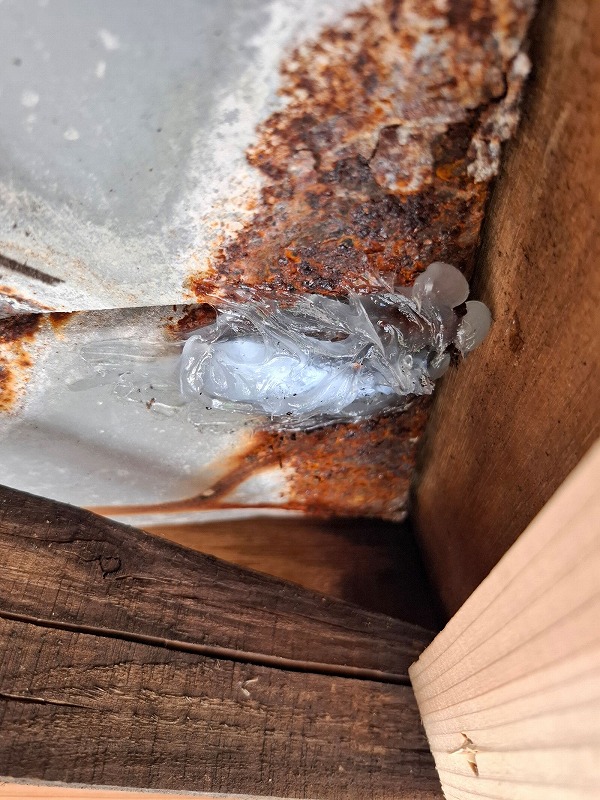 雨水の侵入跡が見られる箇所については、原因となる穴や隙間を一つずつ塞ぎ、防水性を確保するための処置を行いました。金属部のサビが進行している部分には補修材を充填し、今後の雨水侵入を防ぐための下地処理を施しています。