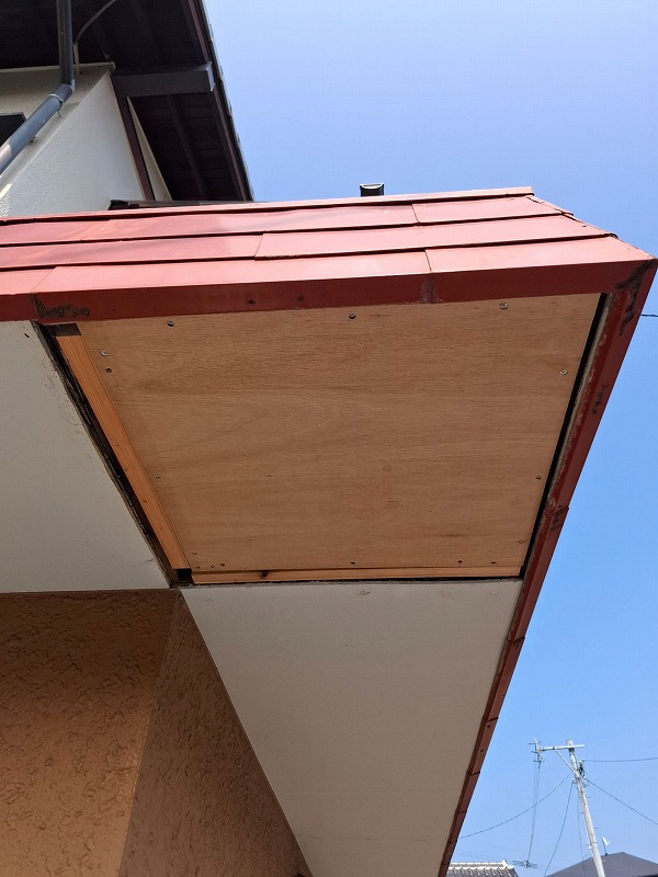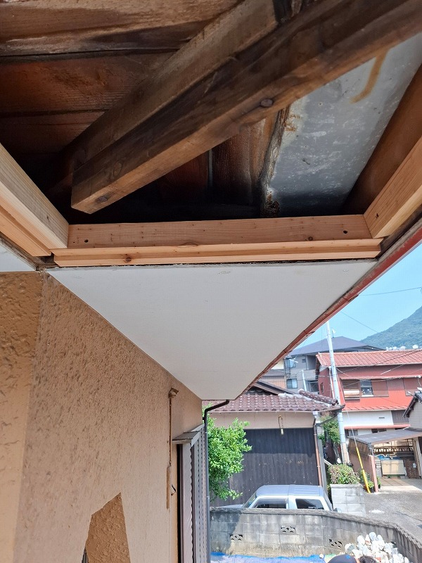 軒天の一部が大きく破損し、表面材が剥がれ落ちている状態でした。経年劣化や雨水の影響により、内部の下地材や構造部分が露出しており、腐食が進行している様子が確認できます。