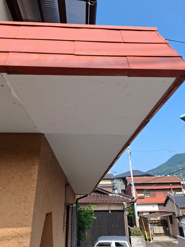 破損していた軒天部分は新しい軒天材で補修を行い、見た目もすっきりとした状態に仕上がりました。内部の下地補強や穴あき箇所の処置も行っているため、雨水の侵入リスクを抑え、安心してお住まいいただける状態となっています。外観全体のバランスも整い、建物本来の印象を取り戻しました。