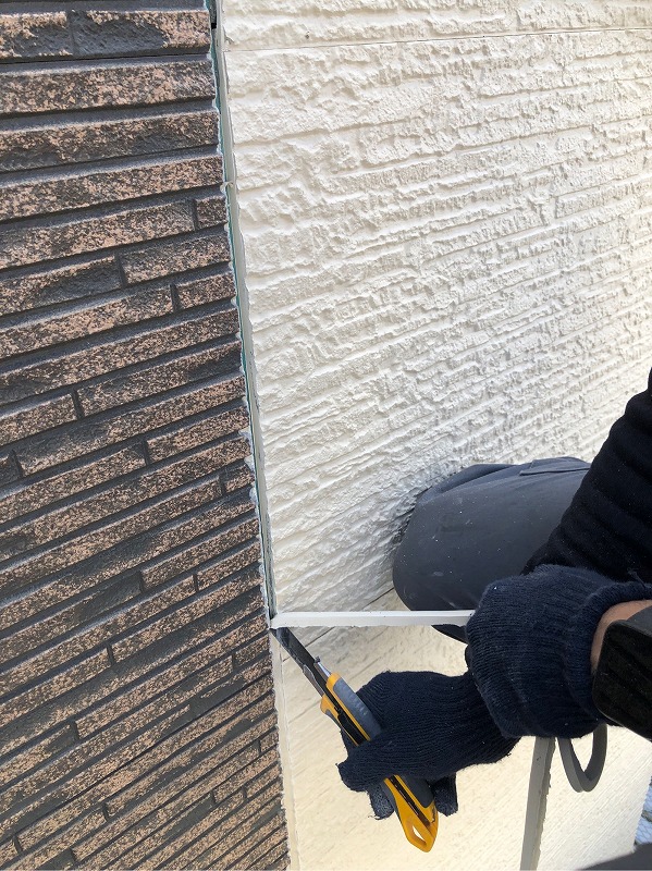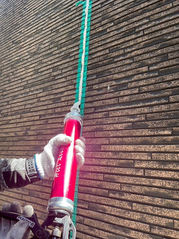 外壁材の継ぎ目や取り合い部分は、雨水の侵入や建物内部への影響が出やすい重要なポイントのため、マスキングテープで周囲を丁寧に養生し、はみ出しやムラが出ないよう慎重に作業を行っています。