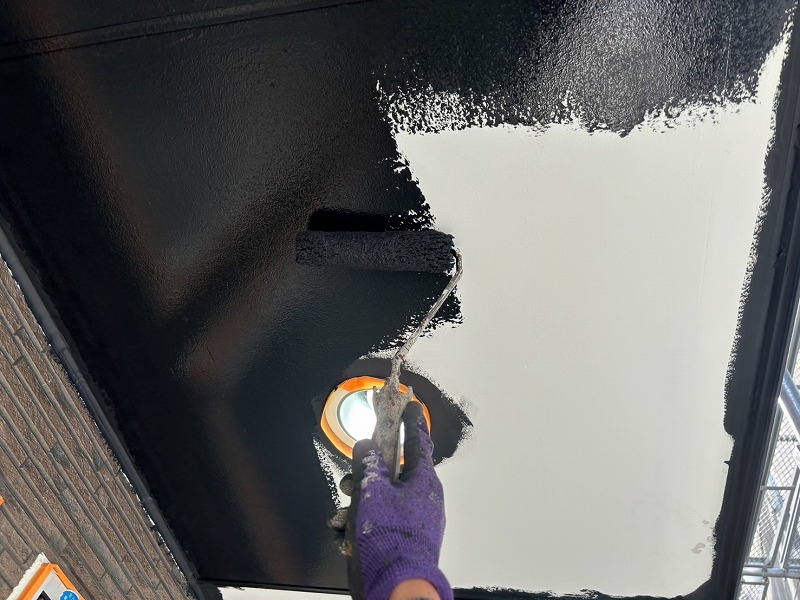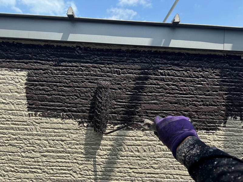 中塗りの段階では、仕上がり時の色ムラや艶ムラを防ぐため、塗料の含みやローラーの動かし方にも細心の注意を払いながら施工を進めました。外壁の凹凸部分にも塗料がしっかりと入り込むよう、意匠をつぶさず均一な塗膜形成を意識しています。